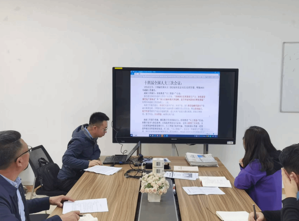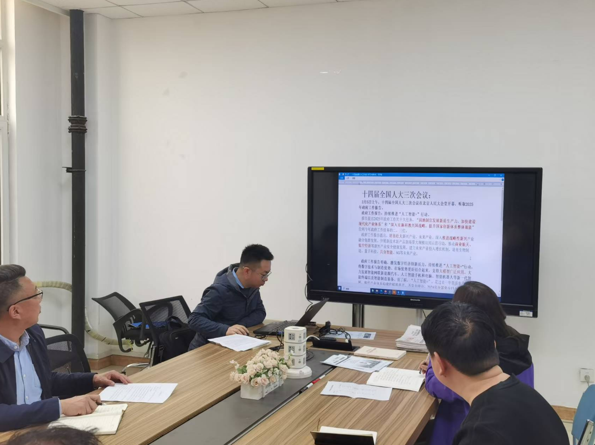 在学习贯彻全国两会精神环节,党支部采取“全景式学习与精准化研讨相结合”的方式,首先系统梳理了十四届全国人大三次会议主要内容,2025年政府工作报告的整体框架与核心要义,随后聚焦“人工智能+”和“人工智能赋能教学”等与高校教师职责密切相关的重点领域开展靶向式研读。政府工作报告提出的2025年政府工作的十大任务中,“因地制宜发展新质生产力,加快建设现代化产业体系”和“深入实施科教兴国战略,提升国家创新体系整体效能”位列今年政府工作任务的二、三位,而这两项任务正好与党支部教师的科研教学工作高度契合。持续推进“人工智能+”行动,将数字技术与制造优势、市场优势更好结合起来,支持大模型广泛应用,培育壮大新兴产业、未来产业,这不仅是产业升级的引擎,同时也是我们高校教师科研教学工作的方向标。一方面,“发展新质生产力”为人工智能学科发展指明了方向,要求我们立足学科特色,在生物制造、量子科技、人工智能、大模型等关键领域加强原创性研究;另一方面,“科教兴国战略”则对高校教师提出了更高要求,需要我们深化产教融合,培养既懂理论又能解决实际问题的复合型AI人才。支部教师学习讨论后达成一致:一方面,要与时俱进地学习应用人工智能赋能教学的工具和方法;另一方面,教育不能忽视对学生启智、心灵的培养,不能丢掉对认知能力和解决问题能力的培养,新时代的教育必须回到培养AI无法替代的人的素养,即价值观、审美观、人文情怀、思维力和判断力。作为人工智能领域的教育工作者,我们既肩负着科技创新的使命,又承担着立德树人的责任,必须将国家战略需求融入教学科研全过程。