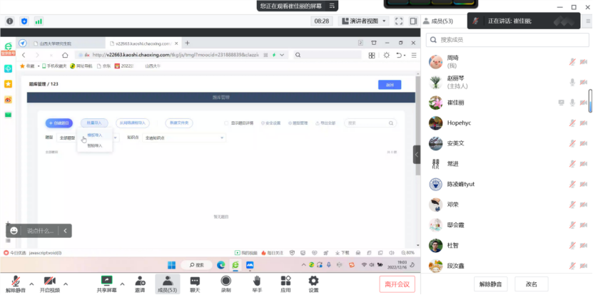 崔佳丽老师针对主考老师如何在超星平台出题、组卷、发布考试、指定监考老师及批阅试卷几个方面进行了讲解,通过实际操作的方式一步一步演示,带领大家熟悉平台的具体操作流程。马晓璐老师针对第二机位监考所涉及到的操作,如分配二机位、设置监考教师、收集课堂码及监考老师的职责等进行讲解,让老师们对平台有了更深的认识,并与参会教师对超星平台操作过程的疑问进行了讨论。