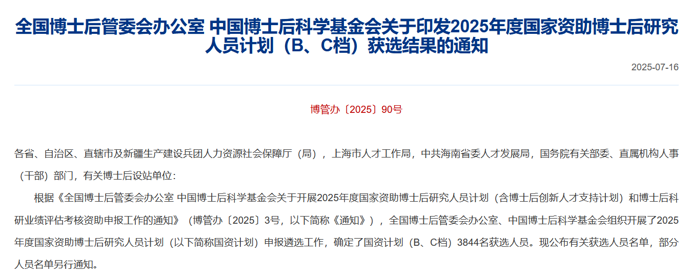 7月16日,全国博士后管委会办公室、中国博士后科学基金会发布2025年度国家资助博士后研究人员计划评选结果。我院安美文教授团队成员郝浩天博士入选C档资助名单,该项目属生物医学工程学科。