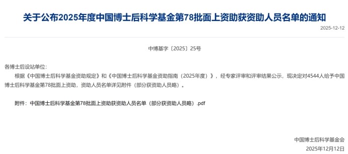 12月12日,中国博士后科学基金会公布了2025年度第78批面上资助评审结果。我院黄棣教授团队青年教师牛小连博士入选获资助人员名单。