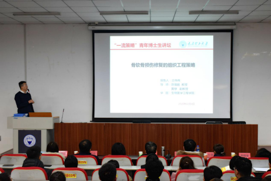 会上,生物医学工程学院2018级博士研究生兰伟伟作了题为《骨软骨损伤修复的组织工程策略》的报告。该报告针对骨软骨损伤这一临床常见的关节疾病的发病症状和治疗方法,从研究背景、研究内容、研究展望三个方面详细介绍了课题的研究历程及实践过程。