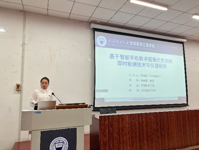 生物医学工程学院2018级博士研究生李海琴作了题为《基于智能手机数字图像比色法的即时检测技术与仪器研究》的报告。研究从色度学体系、生化传感器制备、算法研发等多个方面开展工作,解决了智能手机数字图片比色法的准确性受外界光照环境差异、拍照距离等因素影响的突出问题,并展开了在即时检测技术中进一步的应用,为生化分子高灵敏定量检测提供新的可能。