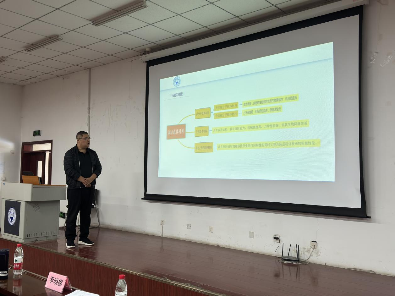 生物医学工程学院2017级博士研究生白雅嘉做了题为《海胆状壳聚糖/羟基磷灰石纳米线复合微球制备及其生物性能研究》的报告。报告中研制的海胆状纳米线纤维微球,其表面呈现类骨基质纤维状结构特征,不仅能够促进细胞的粘附与增殖,同时也有利于药物如抗生素及生长因子负载。因此,有望为骨缺损提供一种新型修复填充材料。