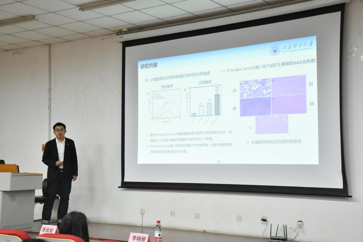 生物医学工程学院2019级博士研究生相昌鑫做了题为《骨与软骨组织工程高强度水凝胶的制备及其力学与生物学表征》的报告。针对骨组织损伤修复,通过简单物理交联方法,制备了具有多孔结构的高强度PVA/nHA/TA水凝胶,该水凝胶具有良好的生物相容性。采用负载Col-I的方法,进一步增强了水凝胶诱导细胞分化成骨的能力,并通过在体实验证明,制备的PVA/nHA/TA/COL可以有效的促进骨损伤的修复。针对软骨损伤修复,采用的冻融循环方法制备了一种仿软骨细胞外基质的可降解PTGH水凝胶,该水凝胶不仅展现出了良好的力学性质,还可以为软骨细胞的生长提供合适的微环境。基于对上述水凝胶的研究,在水凝胶中添加Icariin,制备了PTGH+Icariin水凝胶。通过在体软骨修复实验证明, PTGH+Icariin水凝胶可以促进软骨基质的沉积,实现软骨组织的早期再生,同时,PTGH+Icariin水凝胶的植入还有助于大鼠运动功能的恢复。