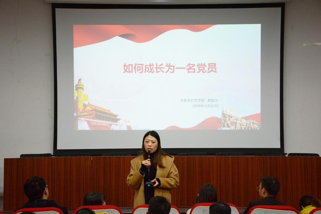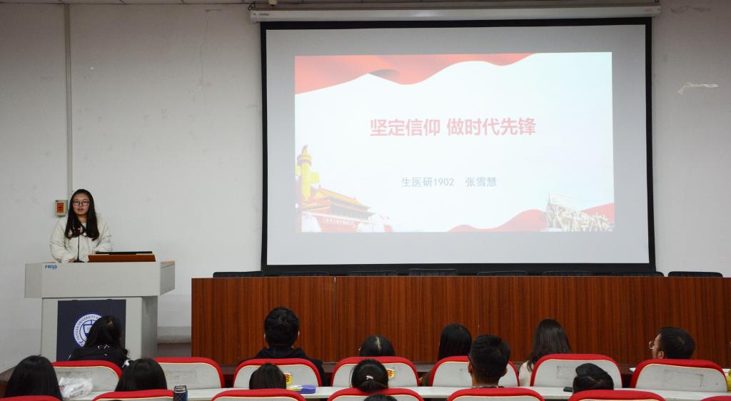 此次分享包括党员发展流程介绍、党员生活分享和互动交流三个环节。生医本科党支部秦韶川同学和研究生第一党支部张雪慧同学作为优秀党员代表进行了分享,通过实例从信仰是什么、党的光辉和力量、如何坚持初心三个方面阐述了党员的信仰和责任,介绍了党员发展流程及要求,分享了自己学习党的先进思想和创新理论的方法。杨雪芬老师总结强调了不断锤炼党性对于党员成长的意义,要求同学们不忘初心、牢记使命,争做有理想、有本领、有担当的新时代有为青年。