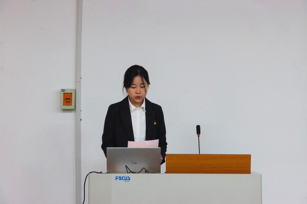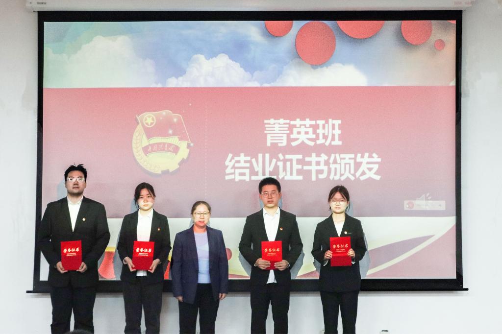 在激昂的共青团团歌中,“菁英班”结业仪式正式开始。会议伊始,班长左婉佳从四个方面总结汇报了青马工程工作,向在场同学简要介绍了青马工程的实施目的、培养方案,回顾“菁英班”在学思践悟理论学习、青马躬行实践锻炼、菁英聚焦能力成长三个板块的具体工作,总结讲述了“菁英班”在理论学习、技能培训、支部宣讲、公众号投稿等方面的傲人成果,通过视频形式与在场同学一同回忆“菁英班”太原三下乡之行。汇报结束后,李昱霞为“菁英班”优秀学员代表颁发结业证书,希望未来他们能努力争当一名政治合格、信念坚定、行动有力的青年马克思主义者。