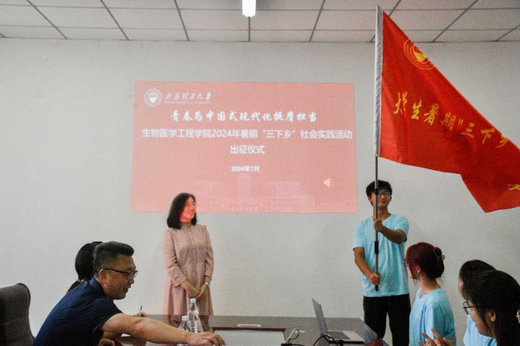 7月6日,生物医学工程学院举行2024年暑期“三下乡”社会实践活动出征仪式。校团委副书记袁泓,院党委书记吕晓勇、院党委副书记李昱霞、辅导员闫建兵及社会实践队员代表参加此次仪式,院团委副书记王铭聪主持仪式。