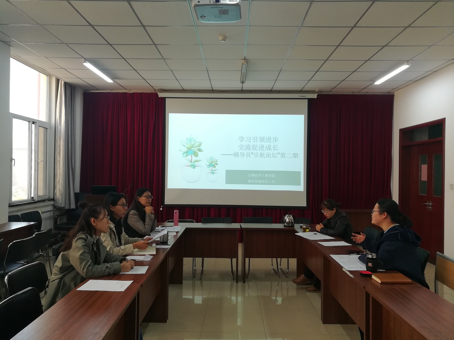 2019年10月30日上午10点整,生物医学工程学院“不忘初心、牢记使命”主题教育暨杨雪芬辅导员工作室能力提升系列活动之二在生物医学工程学院403室举行。生物医学工程党总支副书记李昱霞,轻纺工程学院辅导员高虹老师,生物医学工程全体辅导员参加了活动。