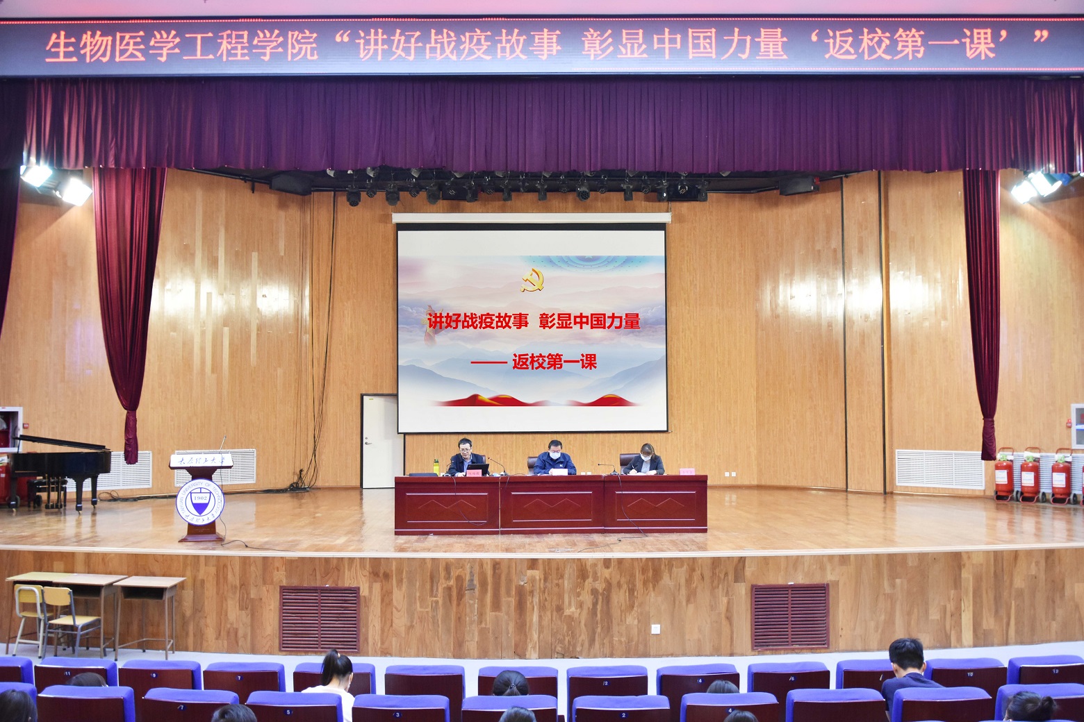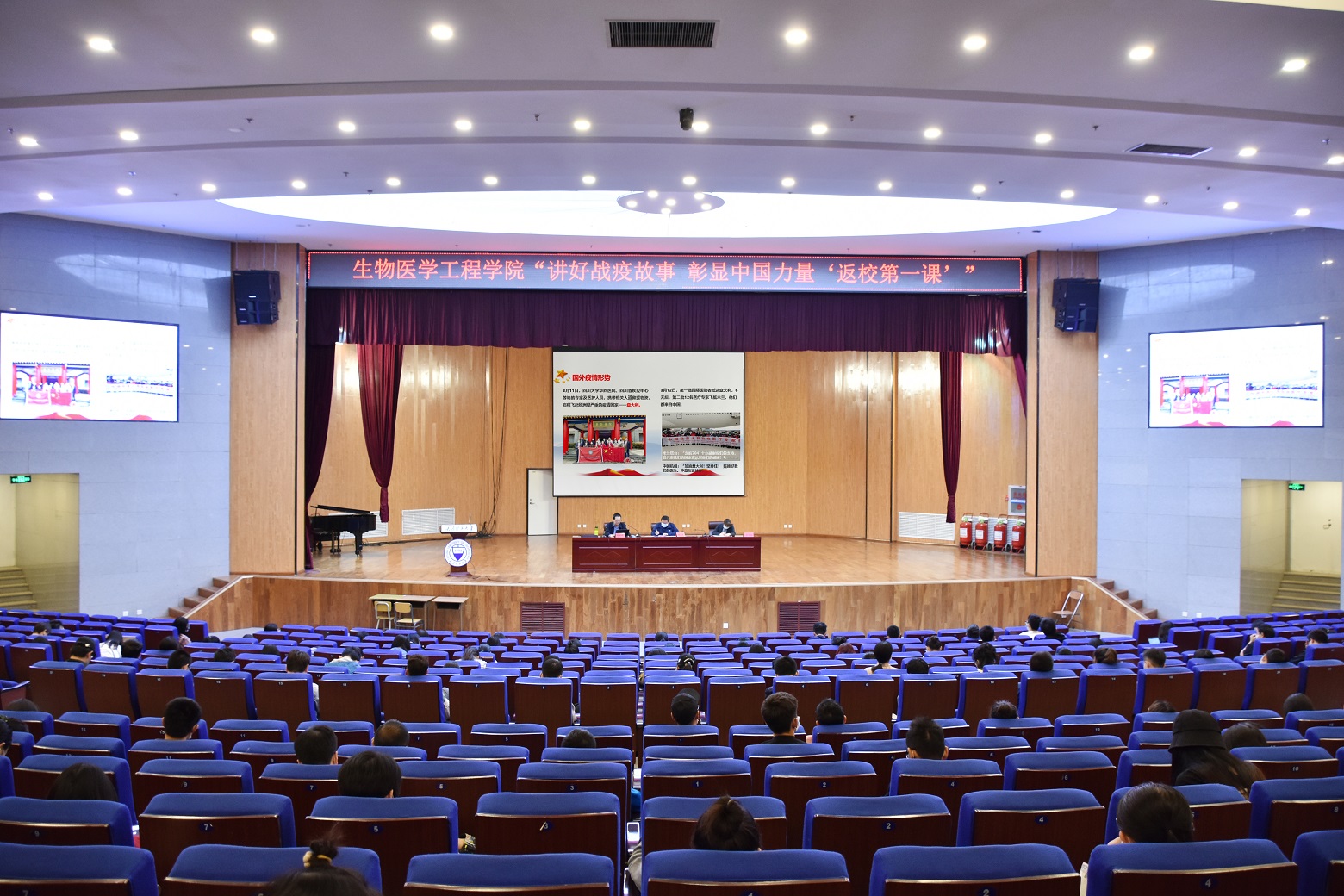 2020年5月1日,生物医学工程学院讲好战疫故事,彰显中国力量——“返校第一课”在明向校区学生活动中心报告厅举行,活动由院党委书记韩志军主持,院长陈维毅主讲,院党委副书记李昱霞、学工办主任、团委书记杨雪芬、辅导员陈立瑾、刘颖以及生物医学工程学院明向校区本硕博毕业生参加了活动。