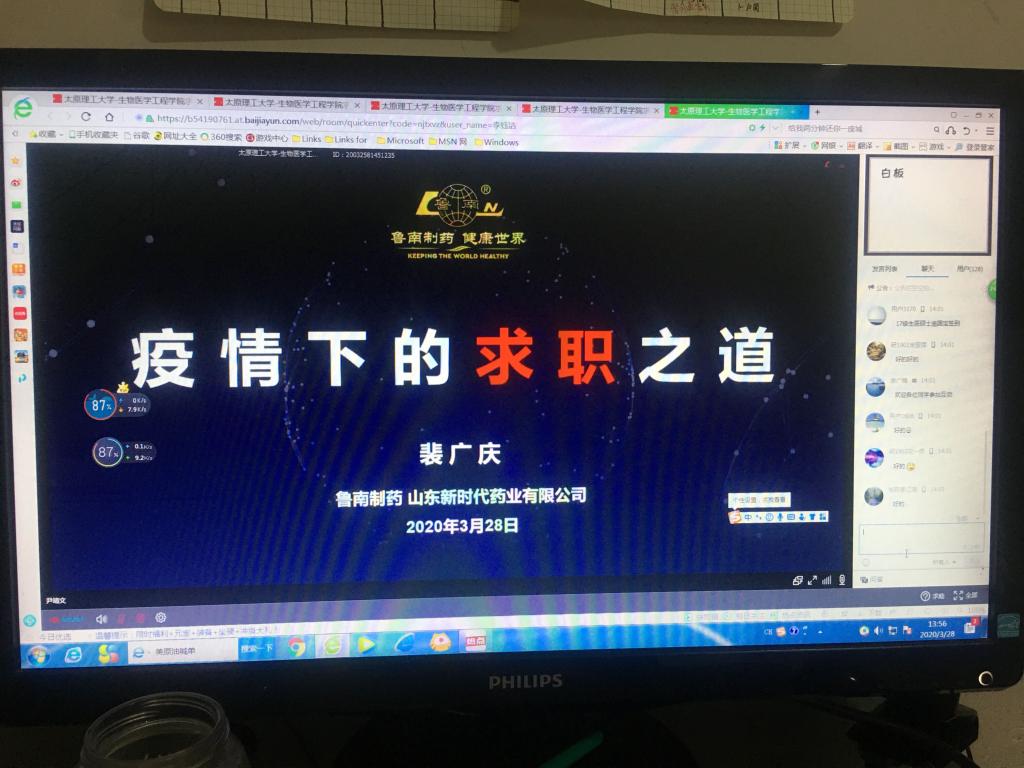 3月28日下午2点,生物医学工程学院联合鲁南制药集团开展了一场线上职业生涯规划课——疫情之下的求职之道。课程由鲁南制药集团山东新时代药业人力资源部主任、职业生涯特聘导师裴广庆主讲,生医学院党总支副书记李昱霞、全体辅导员和本硕学生上线参与了直播课程。