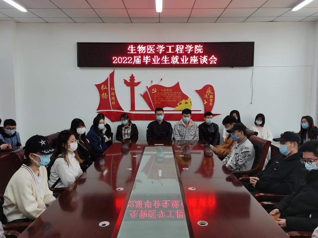 2022年3月30日,为帮助同学们破解就业疑惑、疏导毕业焦虑,扎实推进就业保障工作有效开展,生物医学工程学院于学院408会议室召开2022届毕业生就业座谈会,40名毕业生代表参加会议,院党委副书记李昱霞、学工办主任(团委书记)杨雪芬和辅导员刘颖出席会议。