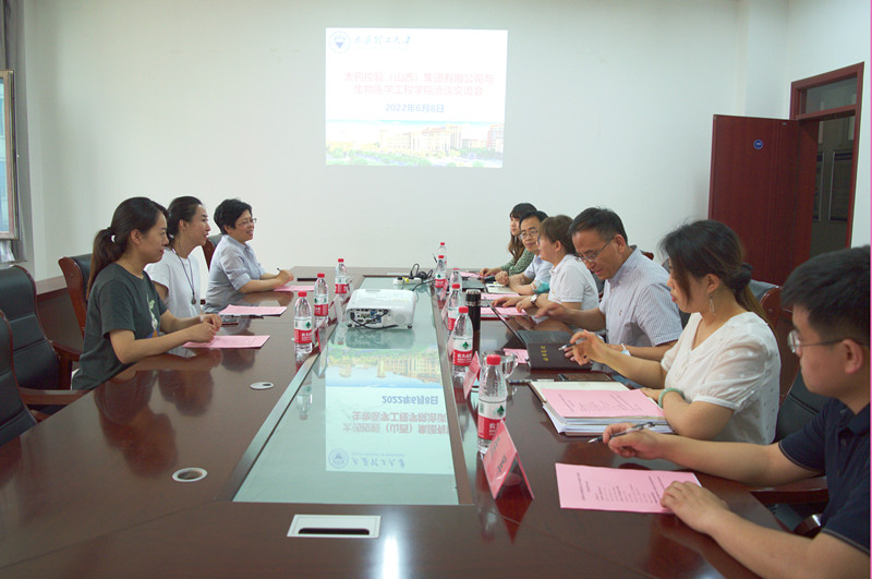 2022年6月8日,生物医学工程学院与太药控股(山西)集团有限公司战略合作洽谈会在学院408会议室举行。太药控股(山西)集团有限公司行政人事总监孙俊玲、人力资源部长韩洁、立业制药综合部部长穆俊丽一行来我院洽谈合作,院党委副书记李昱霞、副院长黄棣教授、生物与制药工程系主任张朝峰副教授、学工办主任(团委书记)杨雪芬、就业专员刘颖、辅导员聂军参加会议。会议由院党委副书记李昱霞主持。