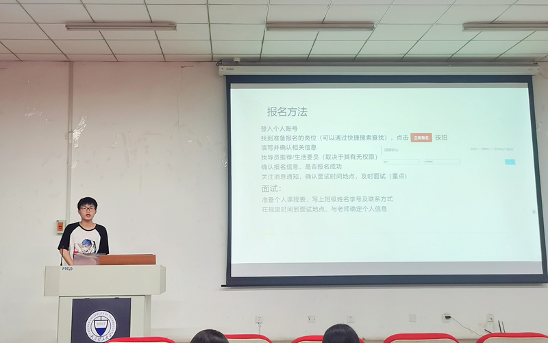 生医2001班严建安同学以自身经历为例,讲解了从获取岗位信息到最终面试成功上岗的整个过程。严建安讲到图书馆管理岗在正式上岗前,需参加书籍整理的培训会,确认本人需要负责的楼层书架区域,每周按规定时间和次数对还书处书籍进行重新上架,并对所负责书架整理。他提到:"在这份工作中,我不仅得到了有形的财富,为家里减轻了经济负担,也得到了无形的精神财富,让我受益匪浅。"
