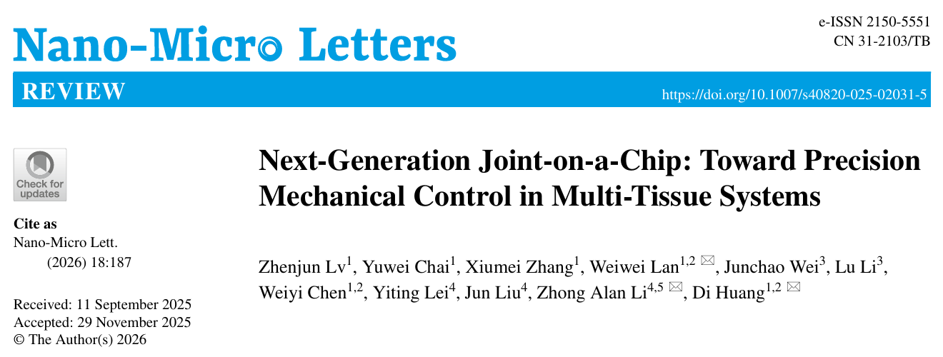 近日,我校yl6809永利集团黄棣教授团队与香港中文大学李中教授团队在国际顶级期刊《Nano-Micro Letters》(SCI一区,IF 36.3)发表了题为“Next-Generation Joint-on-a-Chip: Toward Precision Mechanical Control in Multi-Tissue Systems”的最新成果。该论文的第一署名单位为yl6809永利集团,yl6809永利集团硕士研究生吕振军为第一作者,我校黄棣教授、兰伟伟副教授和香港中文大学李中教授为共同通讯作者。