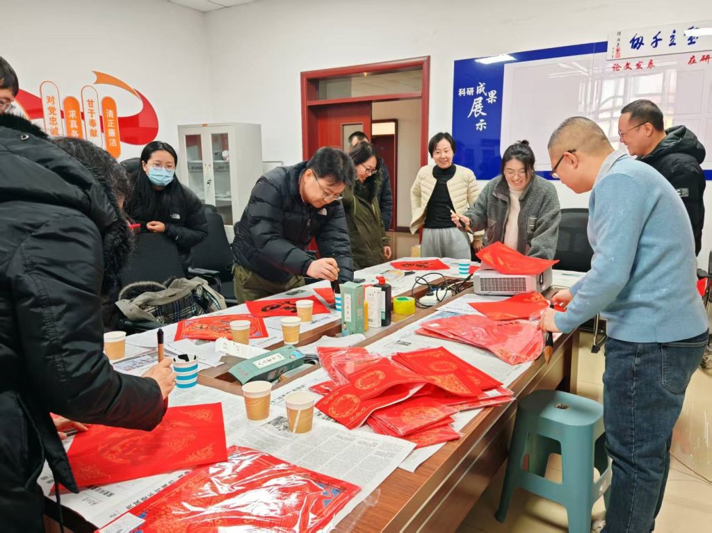 活动现场墨香四溢,红幅铺展,党员教师们齐聚一堂,挥毫泼墨。楷隶行草各展所长,“骏马奔腾传佳绩,教研并进展新篇”等马年主题春联跃然纸上,一个个饱满的“福”字承载着美好期许。大家在笔墨流转间传递温暖,在欢声笑语中凝聚合力。