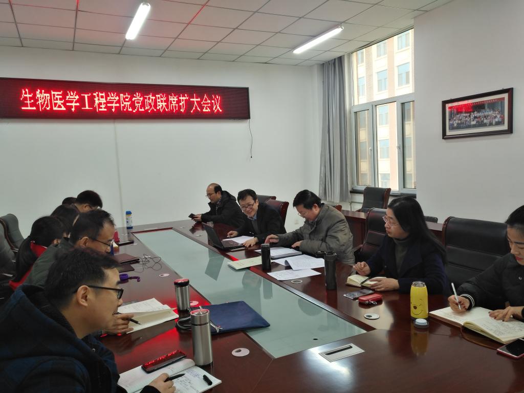 陈院长对学院2019年重点工作做了部署。对新调入学院的7名教职工进行了人事安排。会上还强调了以下重点工作:1、要加大国内外人才引进力度,包括教辅人员。2、本科教学计划审定。3、基金申报工作的落实,我院目前拟申报人数23人,会后要组织符合申报条件的积极申报。4、医工结合工作再推进,重点是与省内医院共建医工实验室(研究所),切实交叉融合,尽早产出成果。5、学院网站建设。6、加强交流、注重学科方向的凝练7、科研实验平台建设的步伐要加快,推动学科建设深层次发展。