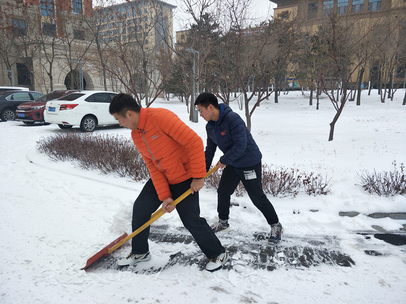 天气虽然寒冷,但同学们都热情高涨,不畏严寒、配合默契、连推带铲、齐心协力地投入到积雪的清扫过程中,大家劳动的热情和团结协作的场面让这个冬日变得温暖。正如习近平总书记在2020年新年贺词中提到,“万众一心加油干,越是艰难越向前。”
