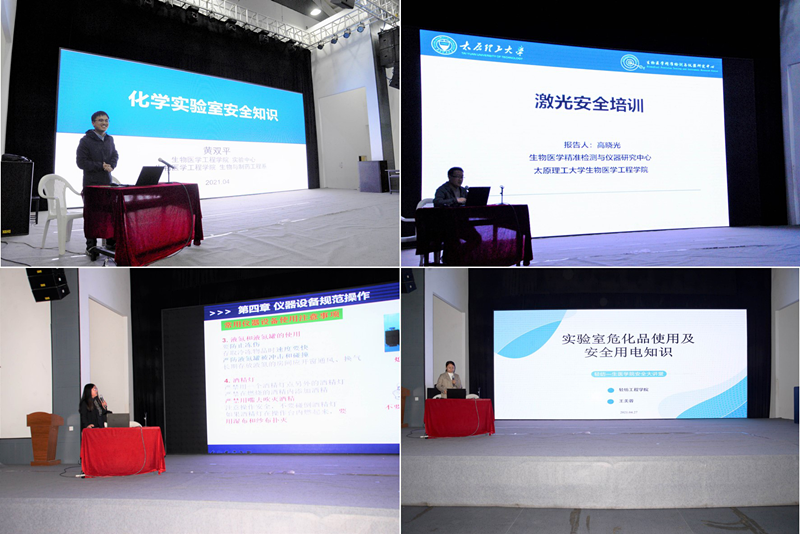生医学院的黄双平博士、高晓光博士、梁紫微博士和轻纺工程学院的王美蓉博士四位老师根据两个学院的科研方向和实验室属性分别做了“实验室化学品安全知识”;“激光使用安全培训”;“实验室生物安全培训”;“实验室危化品使用及用电安全”四场具有针对性的报告。报告从水、电、化学安全、激光使用安全、生物安全、设备使用安全等多方面详细讲授了实验室安全知识,还回顾了国内高校实验室安全事故,同时对发生事故的应对策略及应急处理对策进行了讲解,深入解析了容易引发实验室安全事故的基本要素和实验室常见安全隐患,并就火灾类型、灭火器的种类及使用范围、如何正确使用灭火器及灭火原则等方面进行了有针对性的系统安全培训;报告指出严格的管理和落实实验室安全相关规定是实验室规范和高效的运行的重中之重。