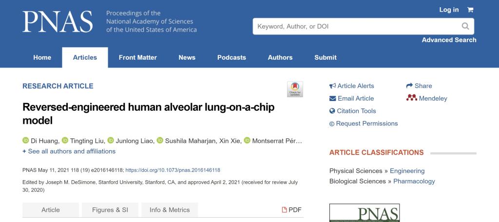 2021年5月,生物医学工程学院黄棣教授第一作者的研究成果“Reversed-engineered human alveolar lung-on-a-chip model”(PNAS, 2021, 118(19), e2016146118. DOI:10.1073/pnas.2016146118)在《PNAS》上发表,共同第一作者还有第九七一医院刘挺挺、东南大学廖俊龙及哈佛医学院Sushila Maharjan,通讯作者为哈佛医学院Y. Shrike Zhang教授。论文作者还包括来自瑞士、意大利、墨西哥、英国等多个国家高校院所的研究人员。
