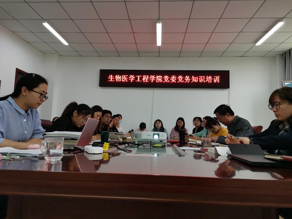 5月14日上午9:20,生物医学工程学院党委在院408会议室进行党务知识培训。院党委韩志军书记、院党委李昱霞副书记、专职组织员、各党支部书记、支部委员以及党员代表参加了培训。院党委书记韩志军主持会议。