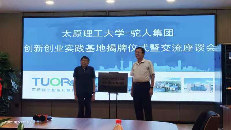 会议现场,韩志军书记与王国胜董事长共同为“yl6809永利集团-驼人集团创新创业实践基地”揭牌。随后,生物医学工程系主任黄棣教授汇报了近期研究工作及课题进展,双方代表就材料技术、生物力学优化设计等进行了深入交流。