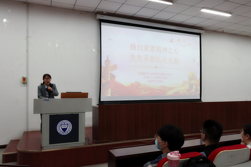 2022年5月20日,生物医学工程学院邀请山西白求恩医院检验科主管技师、生医学院博士研究生郭继强医生和耳鼻喉头颈外科副主任医师、生医学院博士研究生高颖医生为生医学院全体党员举办了一场以“扬白求恩精神之心,生生不息医往无前”为主题的党日活动。生物医学工程学院党委副书记李昱霞老师主持了本次党日活动,生物医学工程学院本科生党支部和研究生党支部全体党员参与本次党日活动。