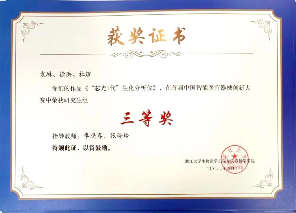 生物医学工程学院李晓春教授、青年教师张玲玲博士指导的芯光智能团队参加了决赛,项目围绕智能医疗器械研发和产业领域存在的问题,运用相关专业知识,做出具有新颖性、可行性和实用价值的参赛作品《“芯光1代”生化分析仪》,最终荣获三等奖。于2022年6月3日收到获奖证书。