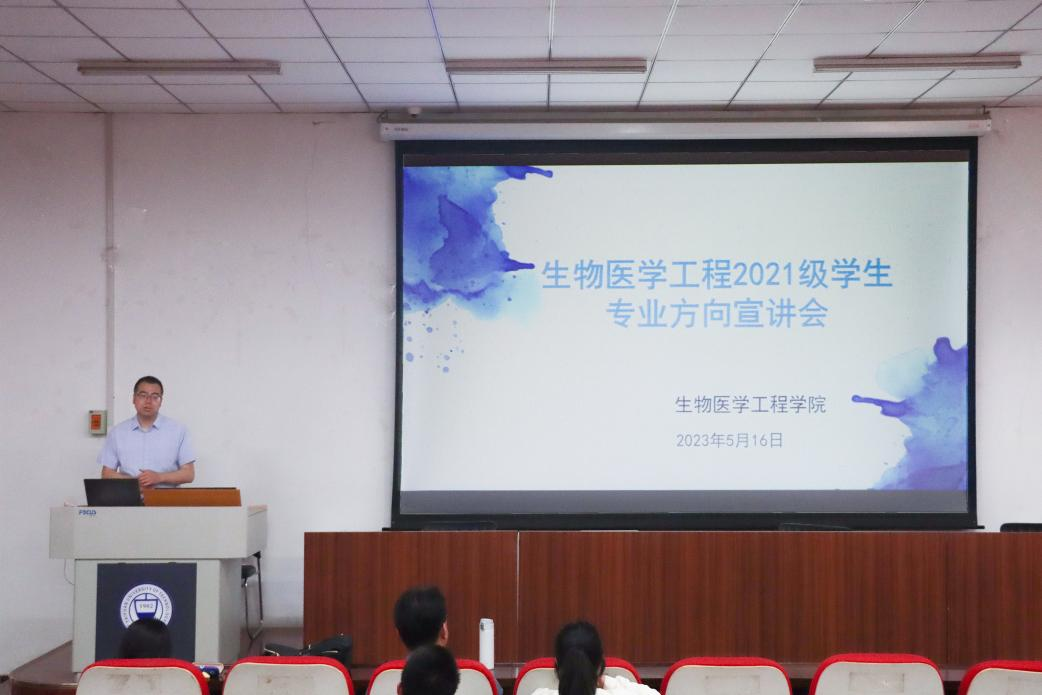 为了帮助生物医学工程专业2021级本科生更好地了解专业方向,制定未来规划,2023年5月16日中午13时,生物医学工程学院于学院一层报告厅成功召开了生物医学工程2021级学生专业方向宣讲会。生物医学工程学院武晓刚、张全有、连小洁、王楷群、郭媛等几位老师到场为同学们做讲解,生物医学工程专业21级全体同学参与此次宣讲会。