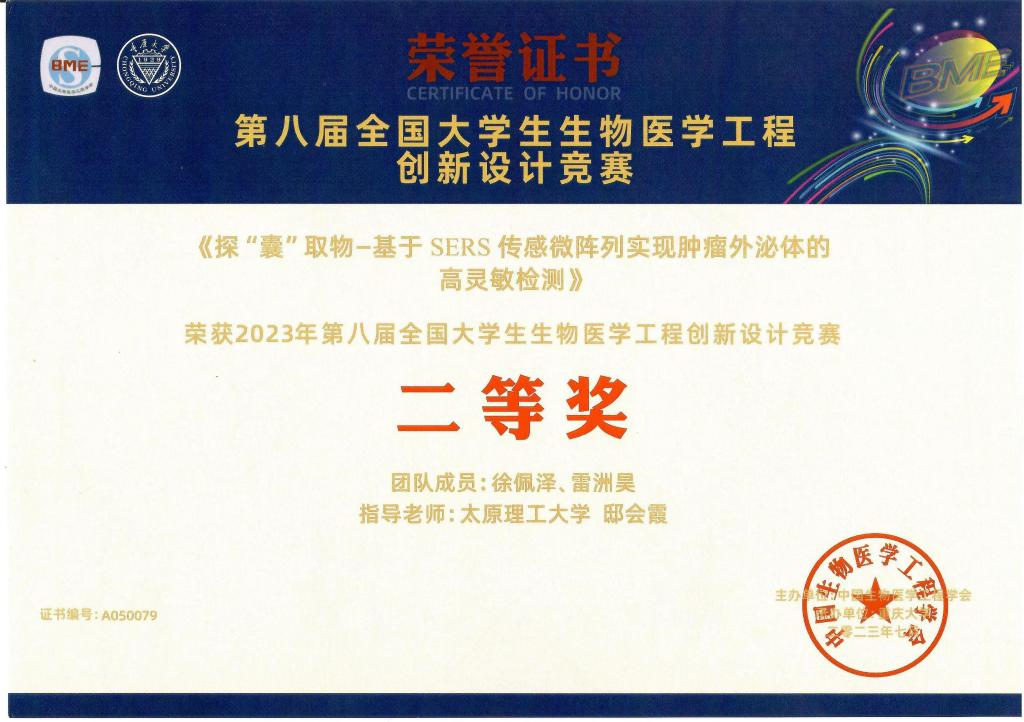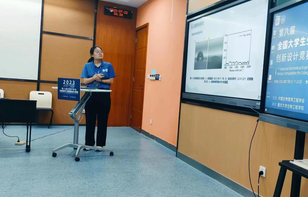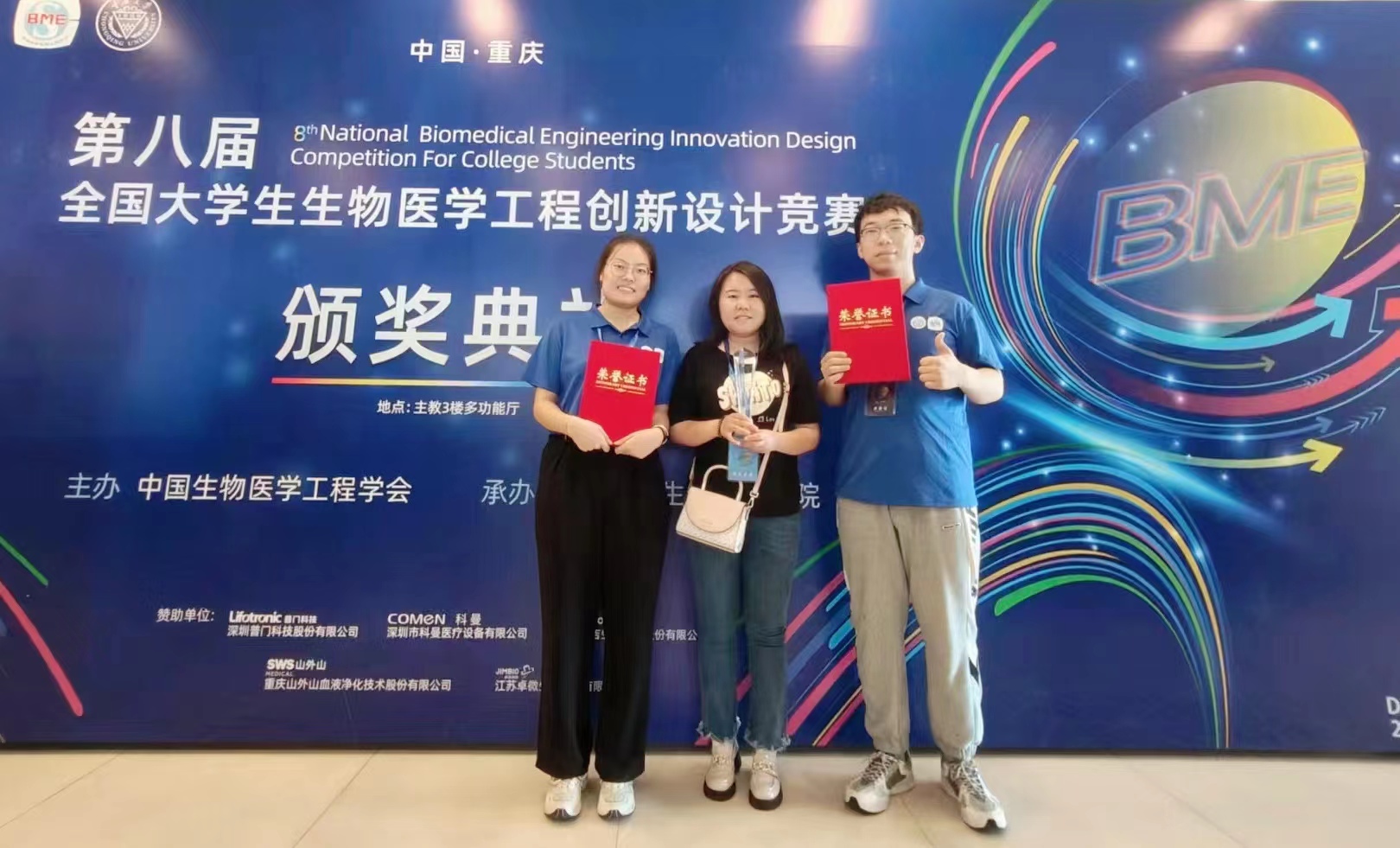2023年7月21日-23日,由中国生物医学工程学会主办、重庆大学承办的“第八届全国大学生生物医学工程创新设计竞赛”决赛在重庆大学举行,生物医学工程学院青年教师邸会霞博士指导的《探“囊”取物—基于SERS传感微阵列实现肿瘤外泌体的高灵敏检测》荣获二等奖。