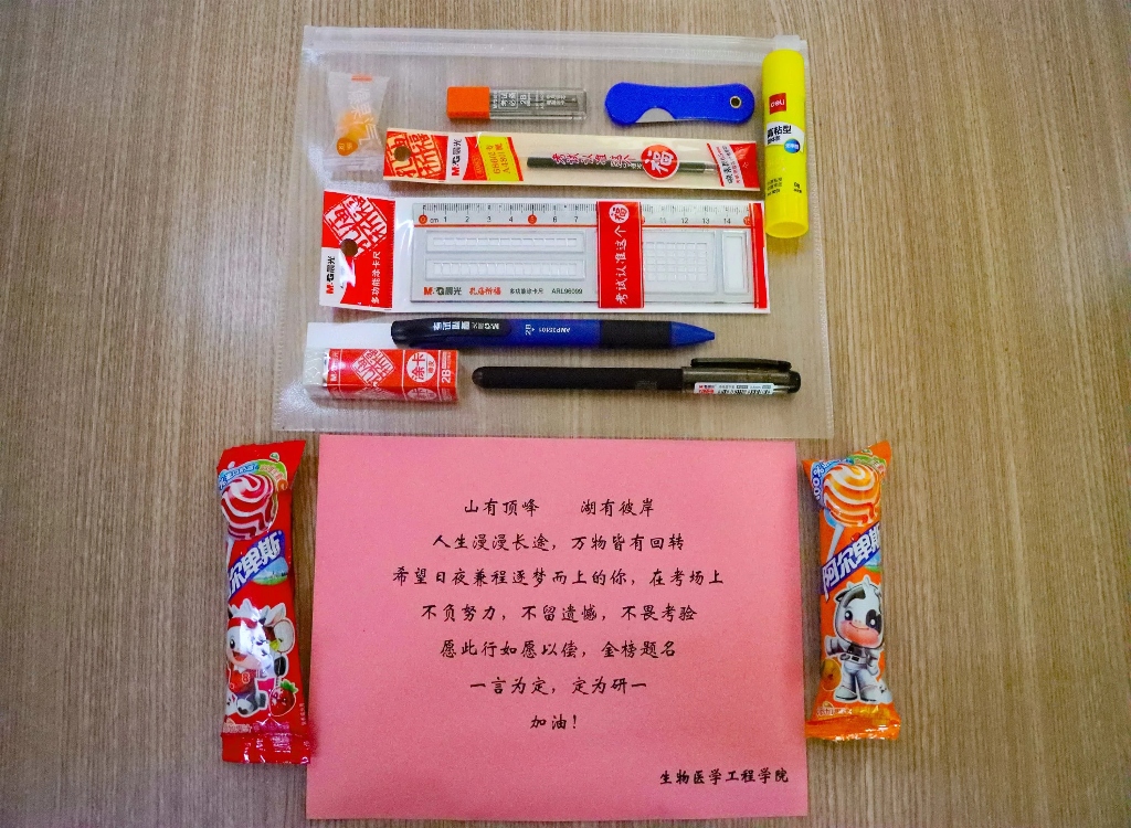 最后,学院为每一位考研学子送上精心准备的考研大礼包,其中不仅有一套透明包装的考试用品以便同学们使用,还有一份祝福考研学子一战成“硕”的寄语卡片,这其中饱含着老师的真挚祝愿和殷切期盼,鼓励与叮嘱在耳畔催人奋进。