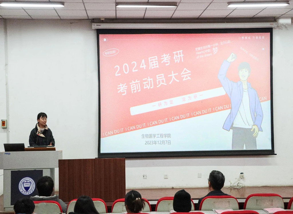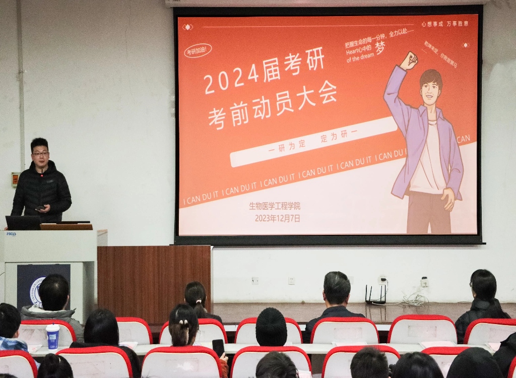 2023年12月7日,生物医学工程学院2024届研究生招生考试考前动员大会于学院一楼报告厅成功召开。本次大会由辅导员史志程主持,院党委书记吕晓勇、院党委副书记李昱霞、学工办副主任兼团委副书记王铭聪、辅导员晋朝阳出席,为即将参加考试的同学加油鼓劲。