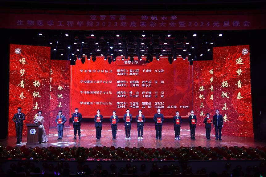 玉兔踏雪奔月去,神龙随春伴云来。生物医学工程学院2023年度颁奖典礼暨2024年“逐梦青春 扬帆未来”元旦晚会在大家的欢呼声中圆满落幕。2024年,我院师生将会以永不懈怠的奋斗姿态奋勇拼搏,开启生医新征程,书写学院新篇章!