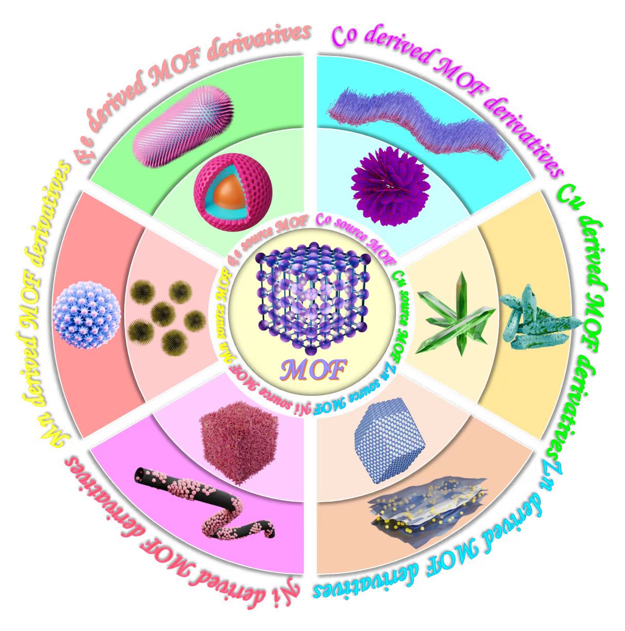 图2. Co、Ni、Cu、Fe、Zn、Mn金属源MOF及其衍生物的说明图。