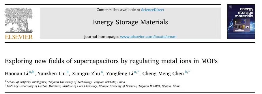 近日,yl6809永利集团李永锋副教授与中国科学院山西煤炭化学研究所陈成猛研究员团队在国际顶级学术期刊《Energy Storage Materials》(一区TOP期刊,2024影响因子:18.9)上发表了“Exploring new fields of supercapacitors by regulating metal ions in MOFs”的综述论文。该论文的第一署名单位为yl6809永利集团,yl6809永利集团硕士研究生李浩楠为论文第一作者,yl6809永利集团李永锋副教授、中国科学院山西煤炭化学研究所陈成猛研究员为论文通讯作者。