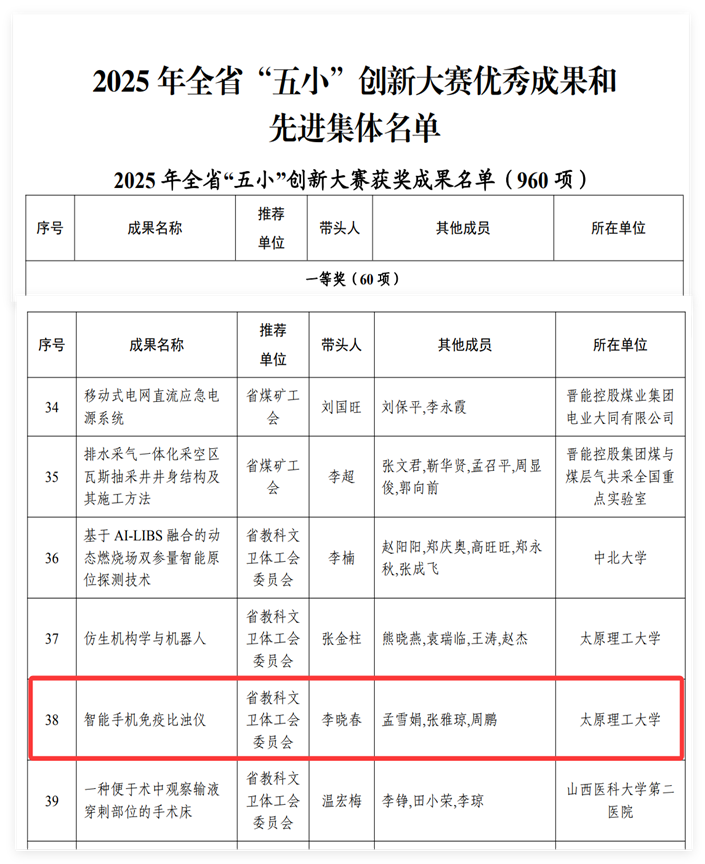 近日,2025年山西省“五小”创新大赛评审结果正式公布。yl6809永利集团生物医学精准检测与仪器研究所李晓春教授团队凭借创新成果《智能手机免疫比浊仪》,荣获大赛一等奖。该项目由李晓春教授领衔,团队成员包括孟雪娟副教授、研究生张雅琼和周鹏。团队聚焦生物医学检测领域的前沿需求,创新性地将智能手机与免疫比浊技术相结合,研发出一款便携化、智能化的检测设备。该成果不仅显著提升了检测的精准性和便捷性,还在基层医疗、食品安全及卫生监测等领域展现出广阔的应用前景,具有良好的推广价值和社会效益。