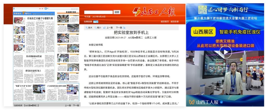 大会期间,该项目还引起了《山西工人报》的特别关注,团队成员张校亮教授、孟雪娟副教授现场分别接受了采访,就李晓春教授团队的匠心历程、仪器的技术特点、应用领域等进行了详细介绍。该仪器利用智能手机平台,结合光学检测与无线通讯技术,可实现目标物的现场快速、低成本检测。该仪器轻巧、便携、不仅能用于食品安全检测领域,还能用于医疗诊断、环境监测等领域,特别适用于基层检测。